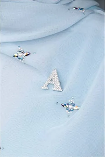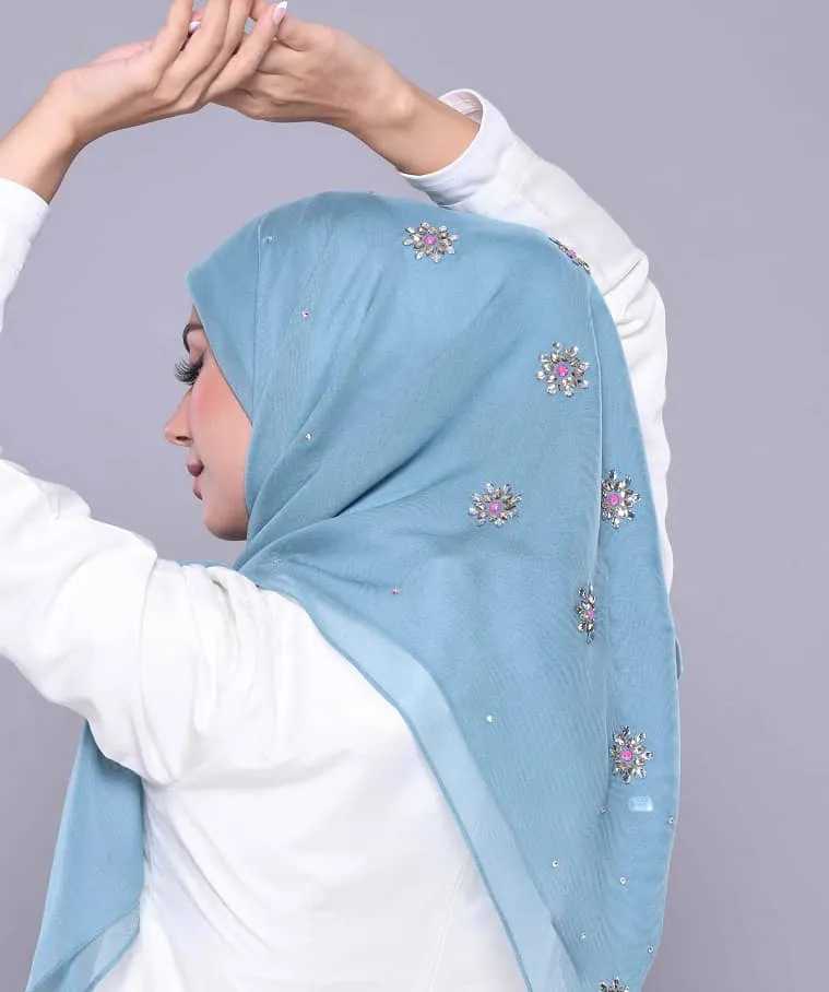 Tudung dengan hiasan kristal yang ditaburkan secara artistik.
